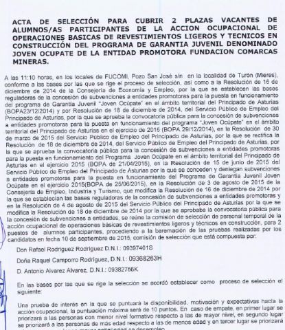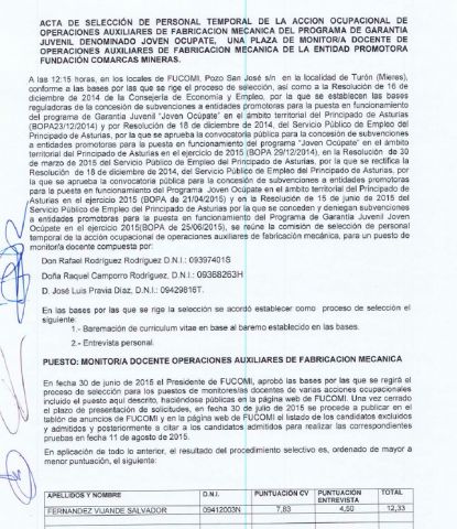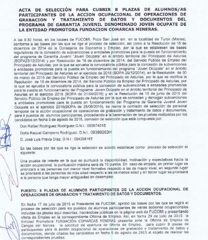 Acta de selección para cubrir 1 plaza vacante de alumnos/as participantes de la acción ocupacional de operaciones de grabación y tratamiento de datos y documentos del programa de garantía juvenil denominado Joven Ocúpate de la entidad promotora Fundación Comarcas Mineras.