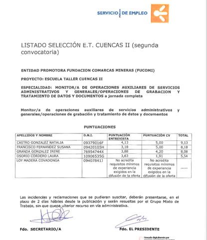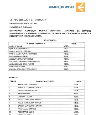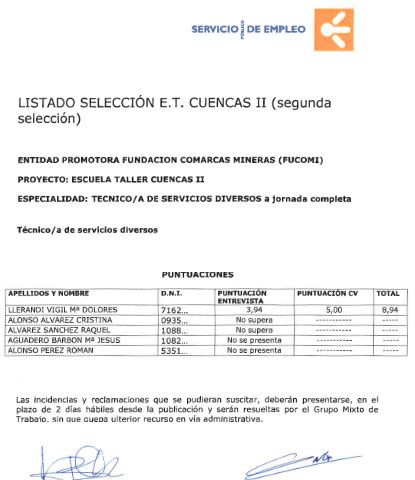 RESULTADO PROCESO SELECCIÓN TECNICO/A SERVICIOS DIVERSOS ET CUENCAS II