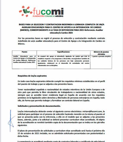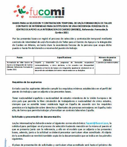 BASES PARA LA SELECCIÓN Y CONTRATACION DE UN/A FORMADOR/A DE TALLER PARA SUSTITUCIÓN DE UNA EXCEDENCIA FORZOSA PARA EL CAI CARDEO.