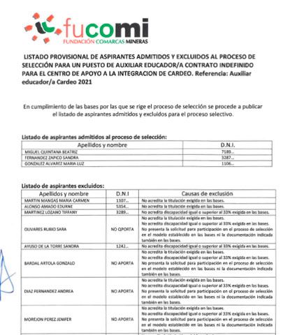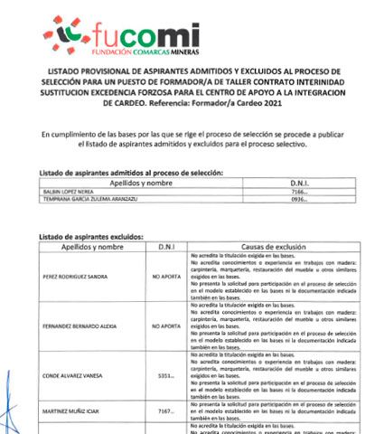 LISTADO PROVISIONAL DE ADMITIDOS/AS EXCLUIDOS/AS FORMADOR/A TALLER CAI CARDEO