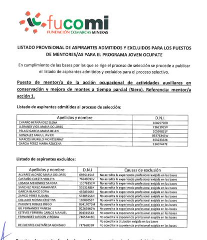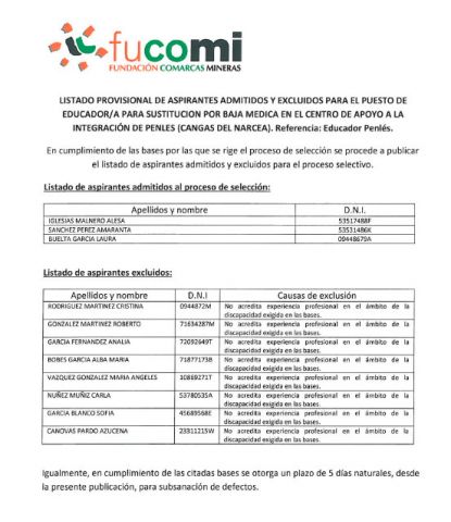 LISTADO PROVISIONAL DE ADMITIDOS Y EXCLUIDOS PARA EL PUESTO DE EDUCADOR CAI PENLES.