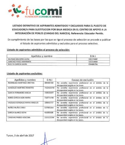 LISTADO DEFINITIVO DE ADMITIDOS Y EXCLUIDOS PARA EL PUESTO DE EDUCADOR CAI PENLES