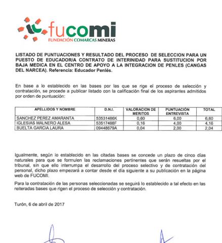 LISTADO DE PUNTUACIONES DEL PROCESO DE SELECCIÓN PARA EDUCADOR CAI PENLES