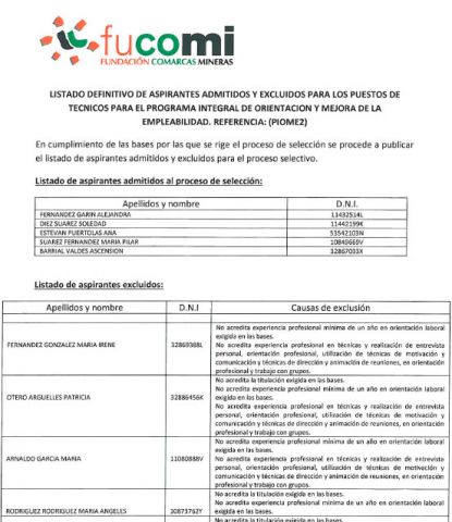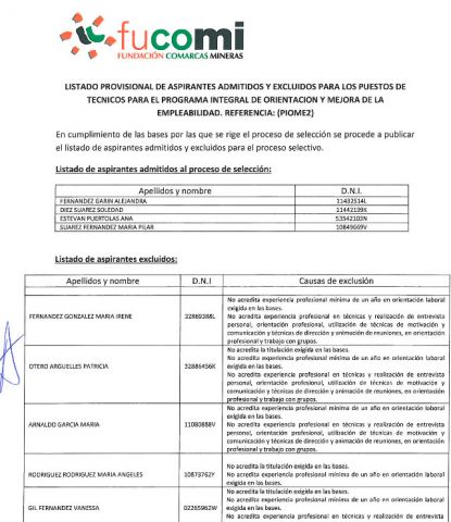 LISTADO PROVISIONAL DE TECNICOS ADMITIDOS Y EXCLUIDOS PARA EL PIOME
