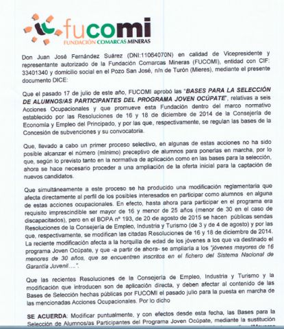 Acta de selección para cubrir 1 plaza vacante de alumnos/as participantes de la acción ocupacional de operaciones de grabación y tratamiento de datos y documentos del programa de garantía juvenil denominado Joven Ocúpate de la entidad promotora Fundación Comarcas Mineras.